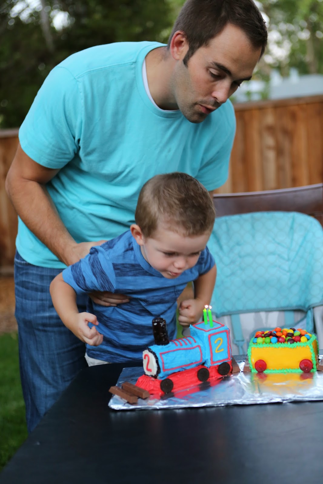 We ate a quick lunch, complete with more "[f]ire" and Hudson went down for his nap. We played more in the afternoon and were excited when Dad got home. Dinner consisted of Pepperoni pizza twist which hudson could dip in pizza sauce--because at this point in his life everything is better when dipped in sauce--and salad with ranch. apparently Hudson became a salad lover over the past month. We took the party outside in our nice little backyard and sang happy birthday, blew out candles, and ate ice cream an d a pretty awesome train cake. My amazing Mother always threw together awesome "shaped" birthday cakes for us growing up, and the train cake made an appearance many-a-birthday. With Hudson's love for trains, and my itching to work on something creative, I went to town creating a train cake for Hudson, which turned into a Thomas cake. I spend way too much time on it, but had so much fun. My day was made when I revealed it to Hudson after his nap and he smiled and said "train!" "Thomas!" "Cake!" Over the next few days the leftover cake was on our counter, and he requested it at least at every meal.
